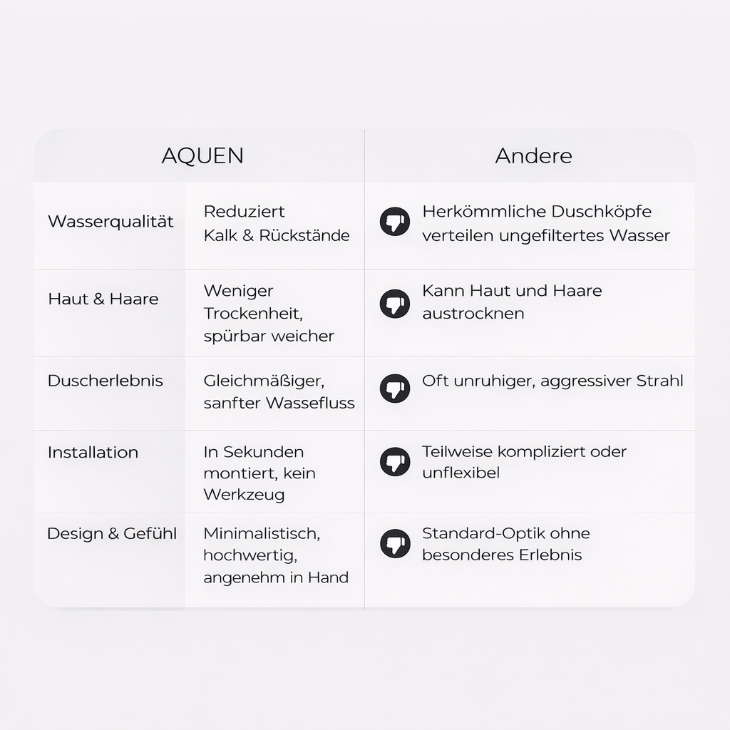 Kalkhaltiges Wasser belastet Haut und Haare – oft ohne dass man es merkt. AQUEN filtert dein Wasser und sorgt für ein spürbar angenehmeres Duscherlebnis. Ab der ersten Anwendung.